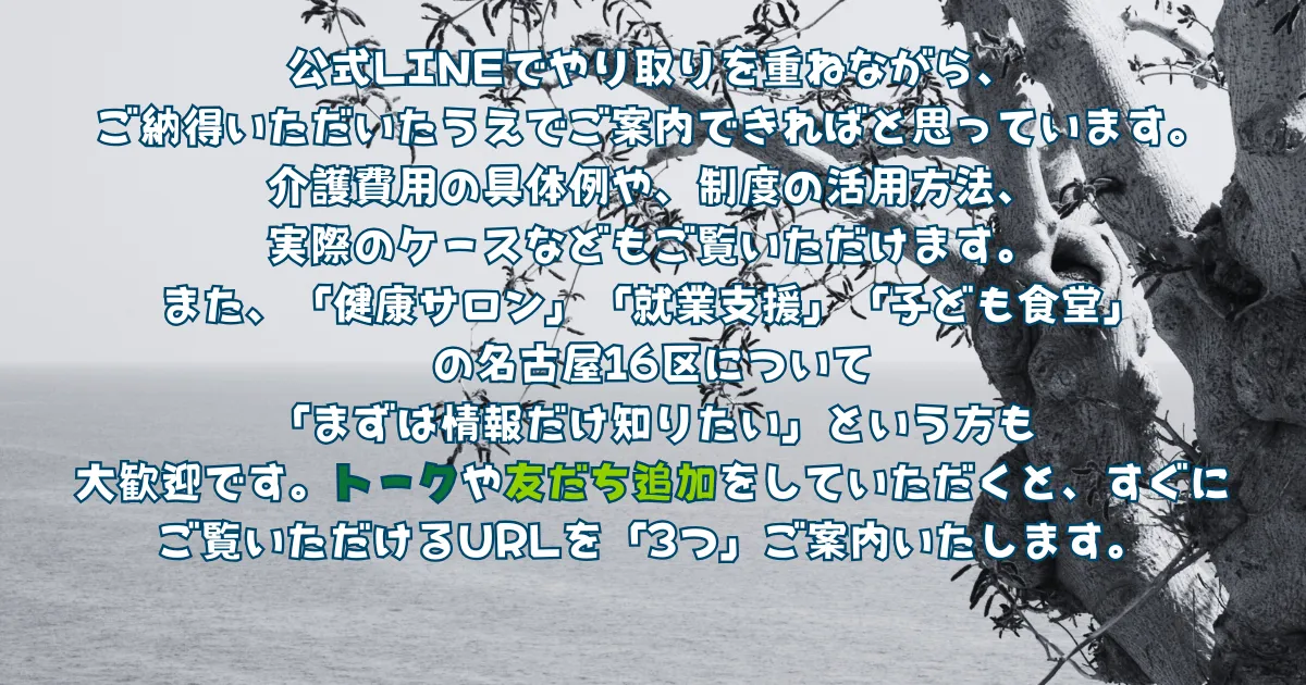 公式LINEにご登録いただくことで、必要な情報をお届けするとともに、個別のご相談にもつなげていきたいと考えています。