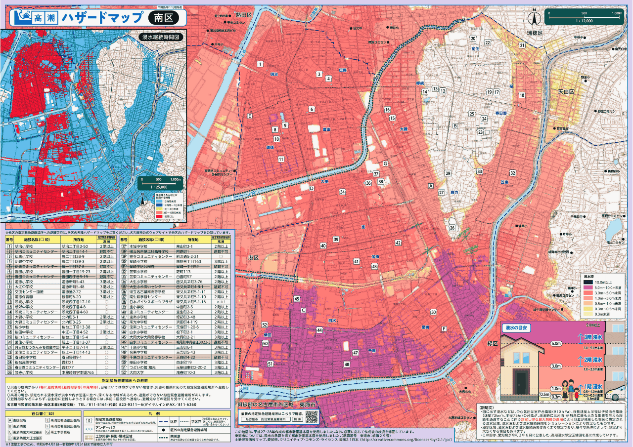 • 市が提供する洪水・内水氾濫ハザードマップで多数の浸水区域が明示されており、浸水継続時間や深さによって避難行動計画が地区単位で策定されています。
