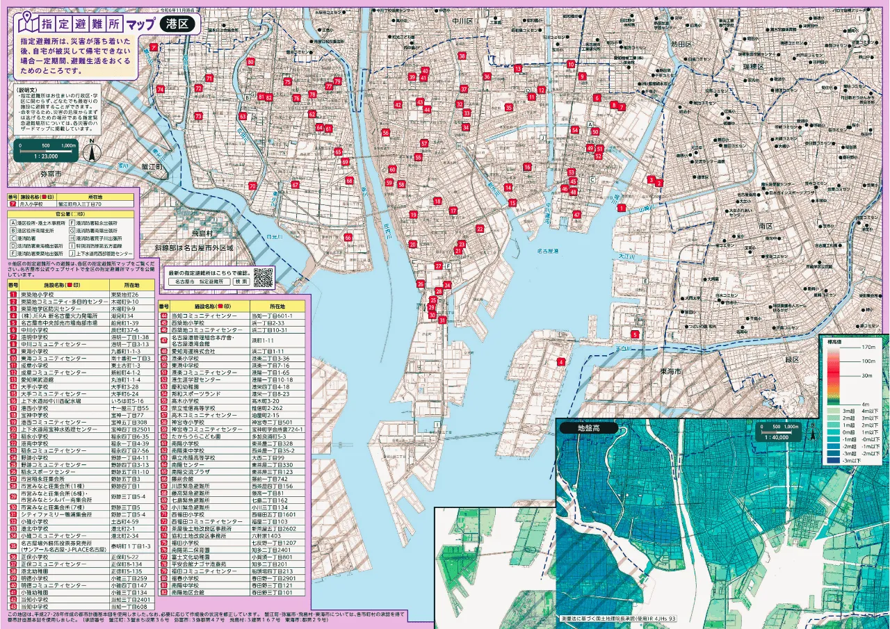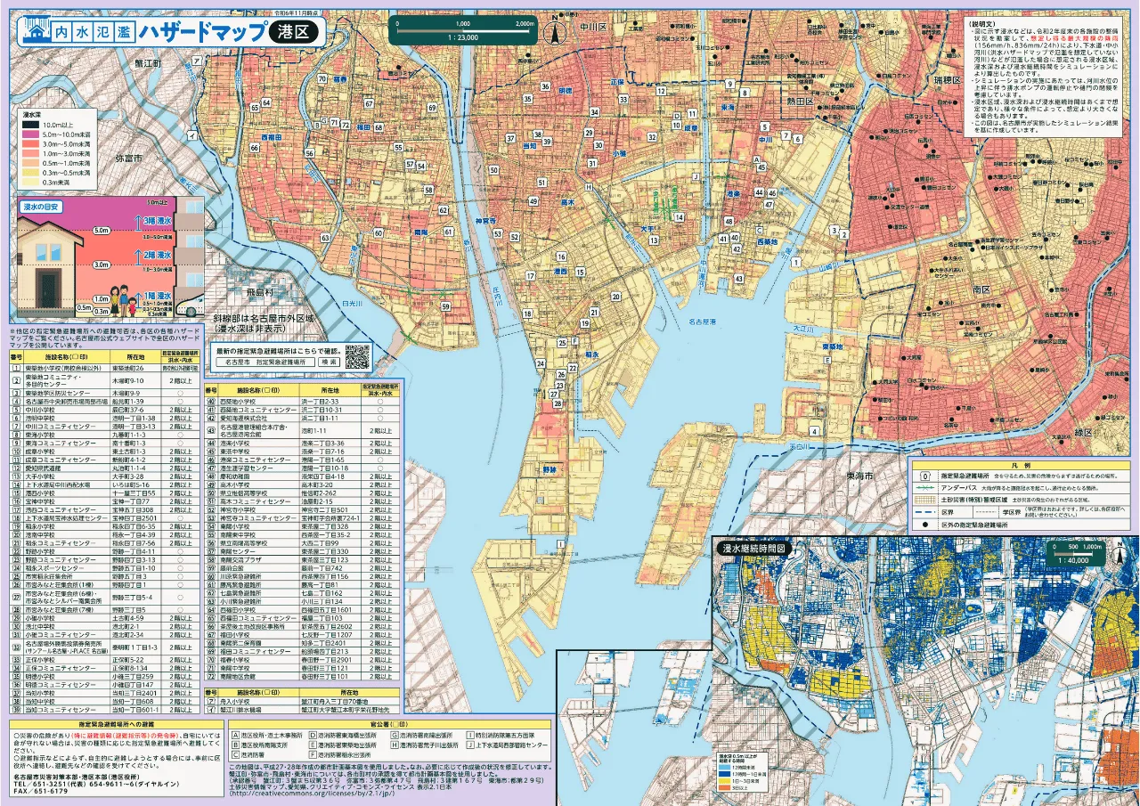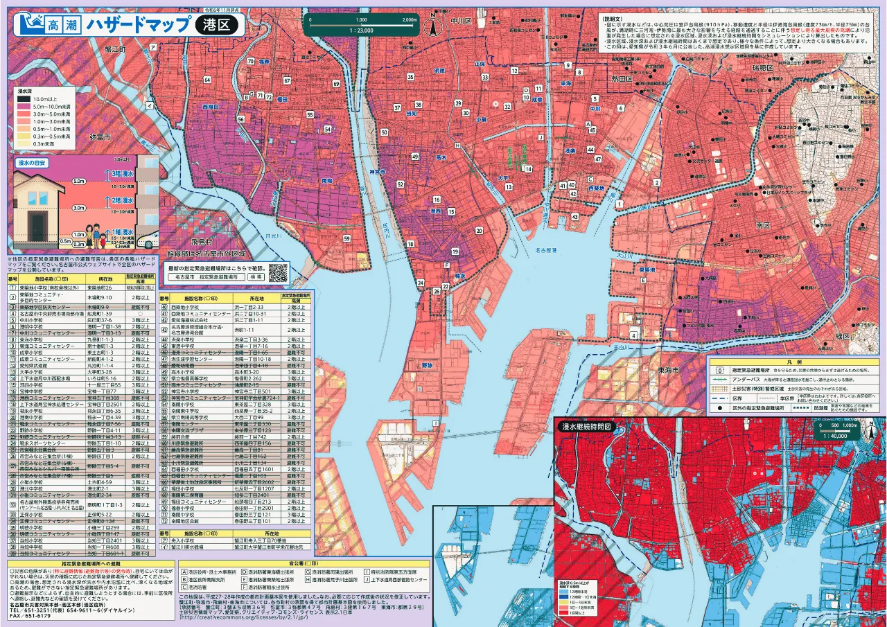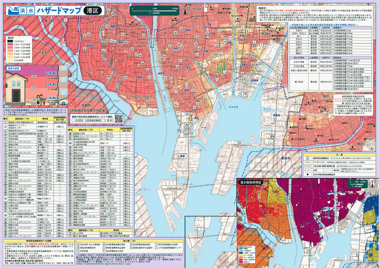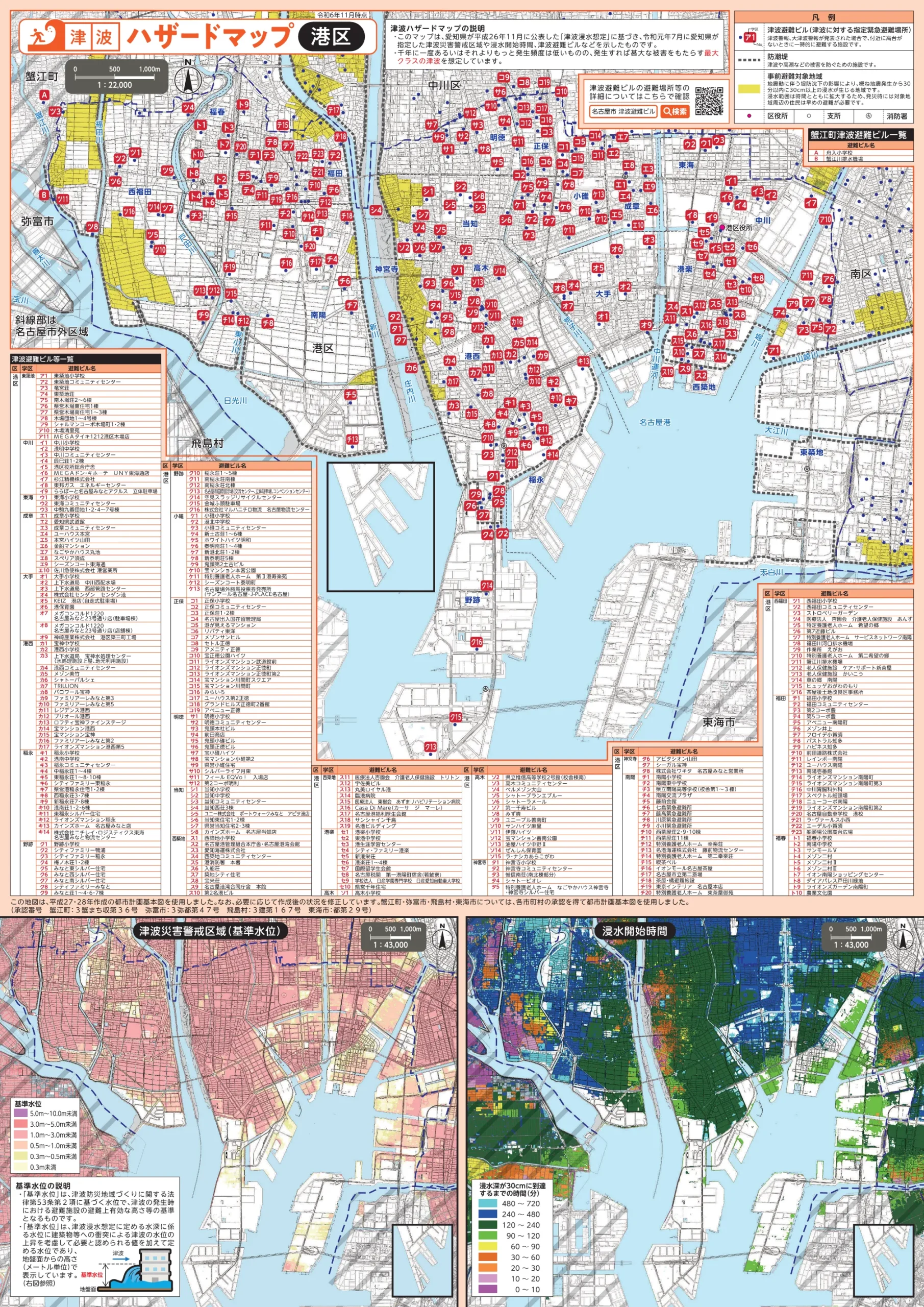 - 港区は名古屋市の中でも津波浸水想定地域の中心。南海トラフ地震では最悪約2.5mの津波浸水が想定されています。