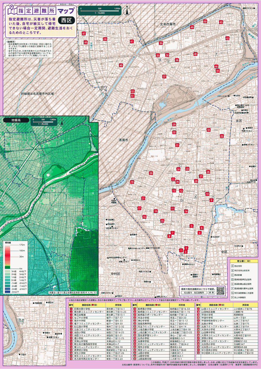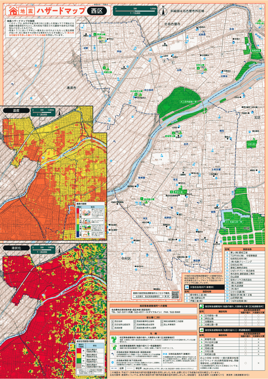 - 名古屋市は西区向けに洪水・内水・高潮・地震・津波・ため池など全6種類のハザードマップを公開しており、スマホアプリやWebでも閲覧可能です。