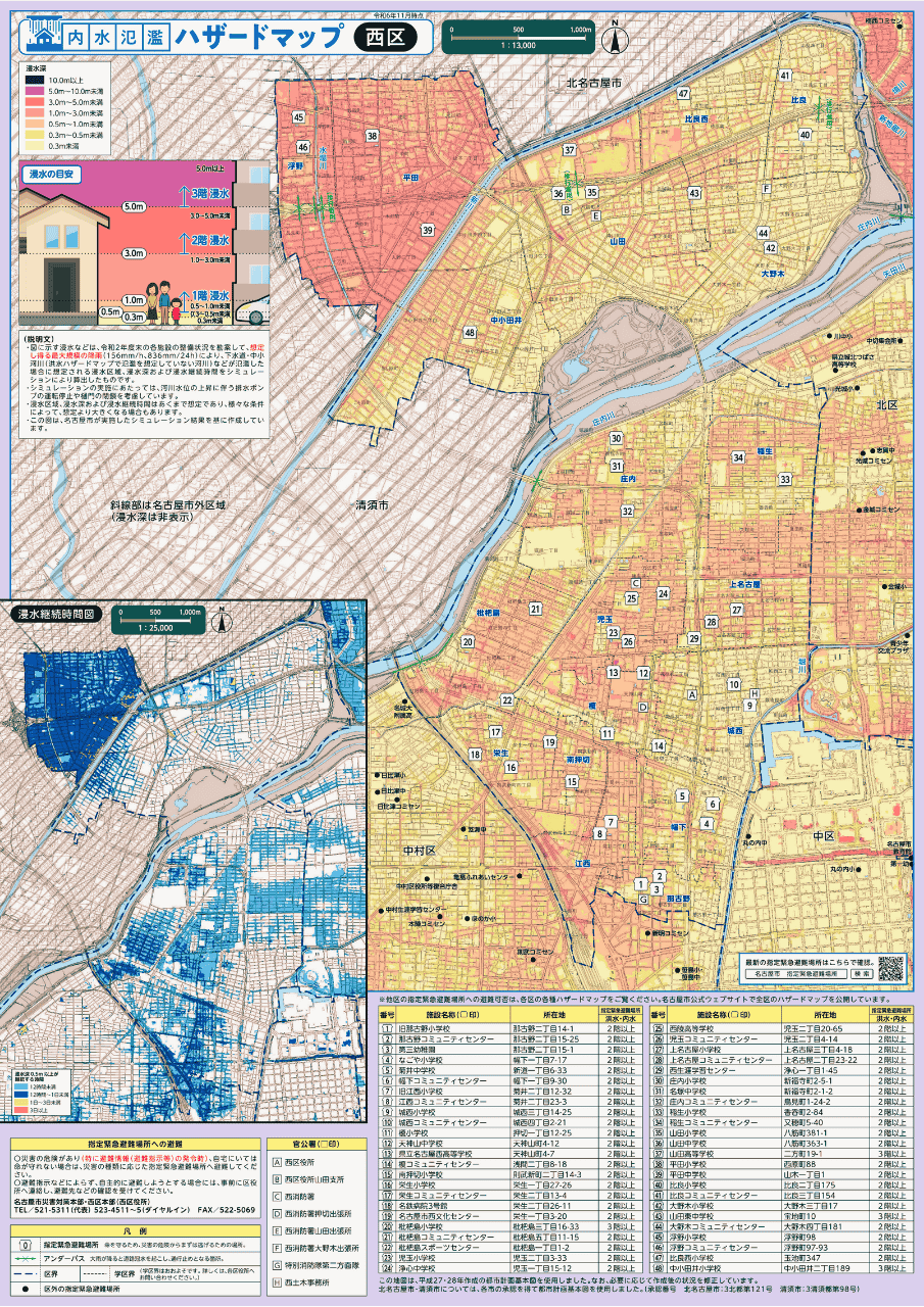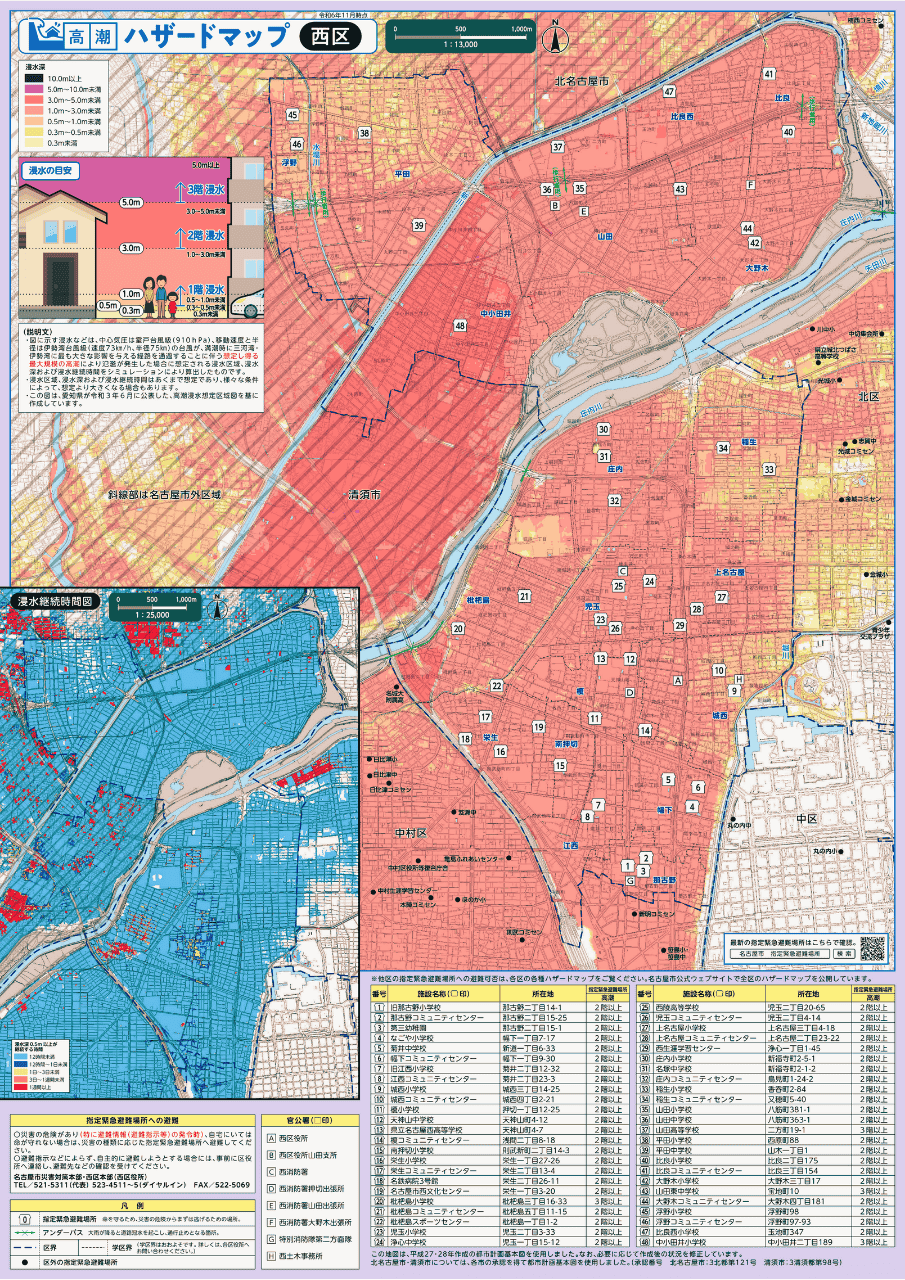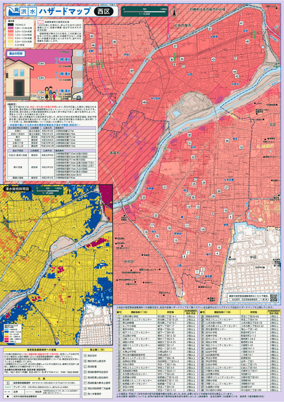 - 西区は庄内川や新川が区域を横断する平坦地であり、最大で3~5m、広範囲では1~3mの浸水が想定されるほど洪水リスクが高いとされています。