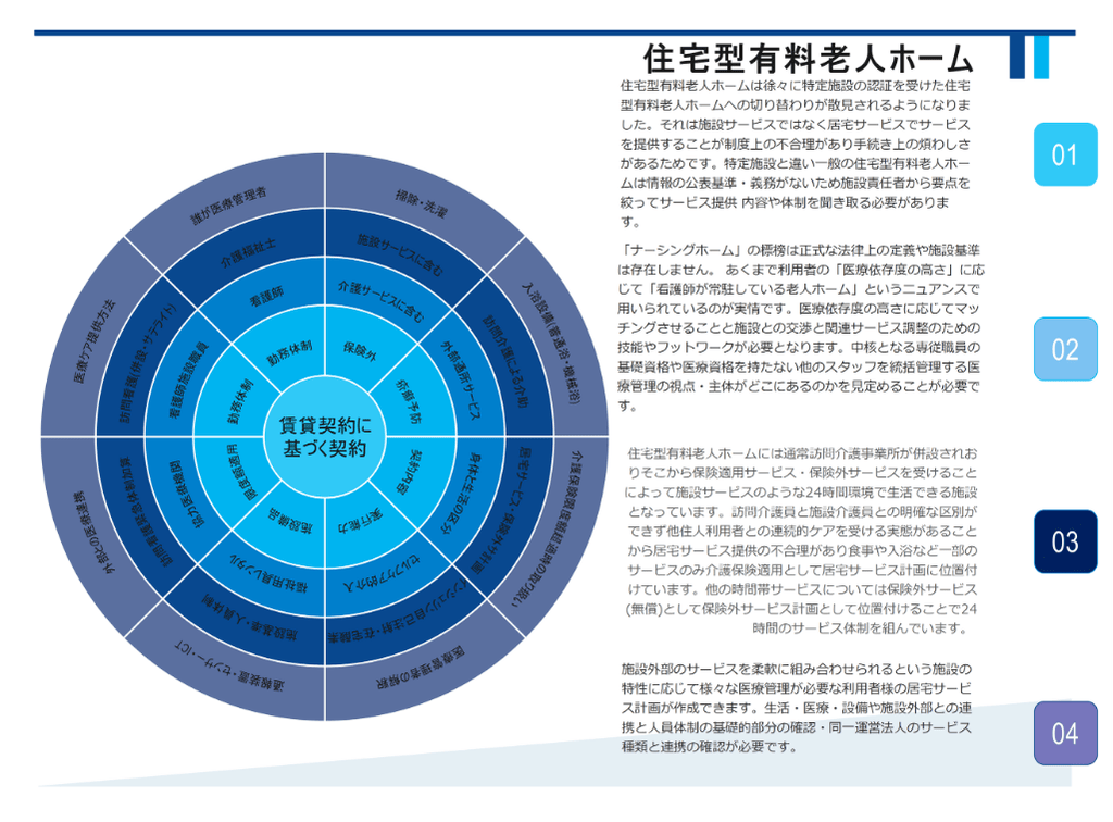 「住宅型有料老人ホームを選ばれる方の多くは、認知症の問題行動や医療的な管理が必要になったことがきっかけです。服薬管理やバイタルチェックはもちろん、点滴・胃ろう・在宅酸素・吸引・カテーテル管理など、医療サポートの範囲は施設によって異なります。
