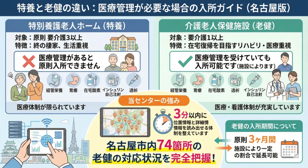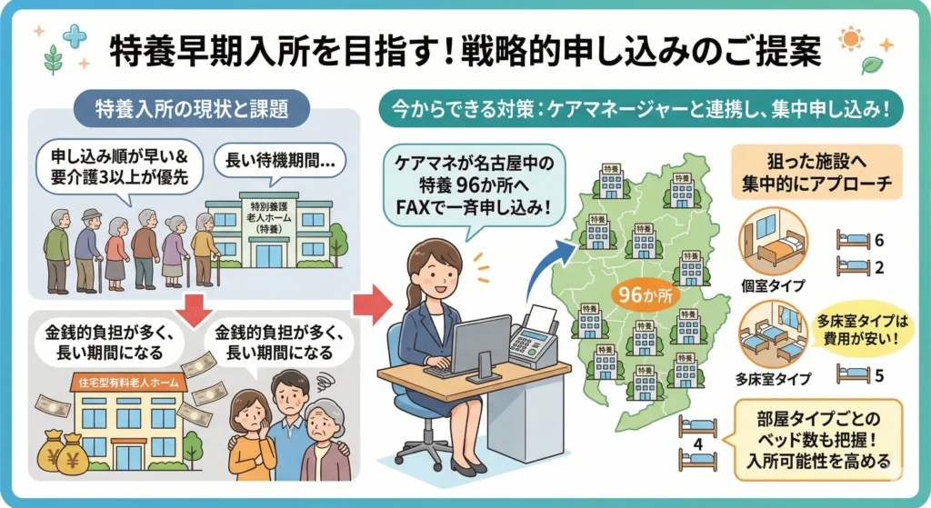 - 名古屋市内全域・尾張西部・尾張東部・三河東部・三河西部など 愛知県内全域の特養に対して一括して入所申し込みできます