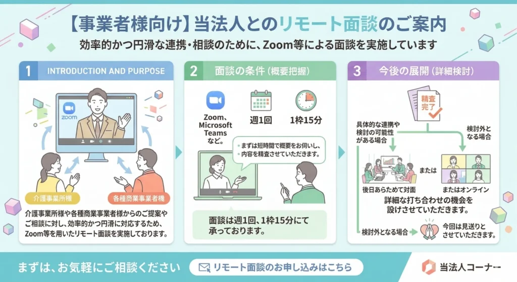 こちらのリモート面談申し込み(Zoom推奨)は、営業・取材・ご提案を希望される事業者様専用です。ご利用者様や一般のご相談につきましては、通常のお問い合わせ窓口をご利用ください。